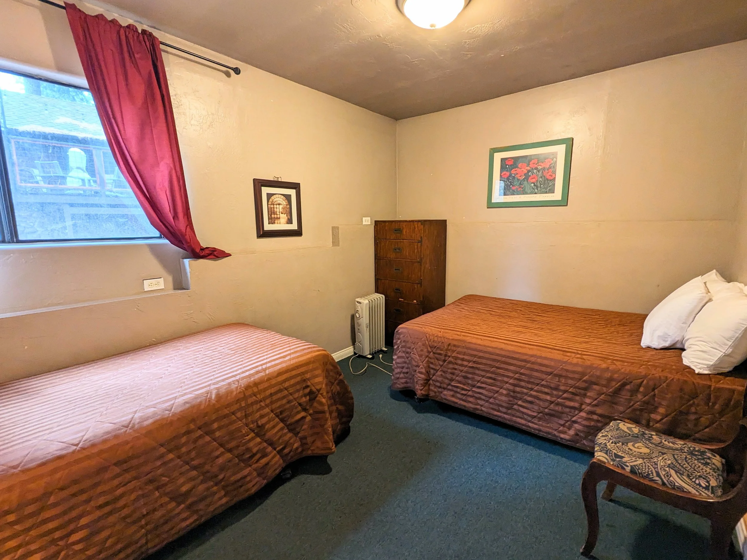 The Meadowlark is a four bedroom cabin that sleeps up to eight people in comfort. This cabin features a bedroom with a king sized bed, a bedroom with a queen sized bed, a bedroom with a double and twin bed, and a bedroom with a twin bed. It also has a living room with a wood burning fireplace, as well as a full kitchen.